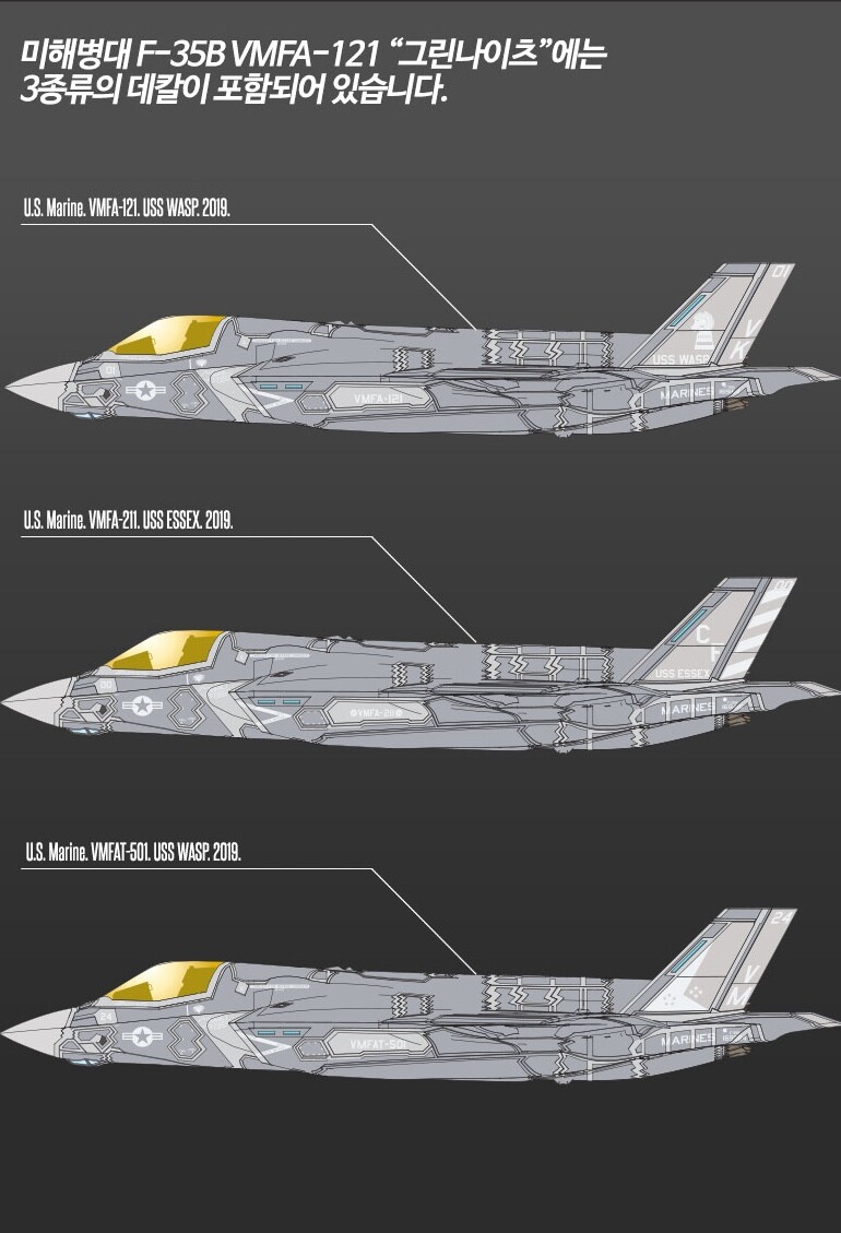 F-35B Lightning II від коррпусу морської піхоти США VMFA-121 — це багатоцільовий винищувач-бомбардувальник п'ятого покоління, здатний до короткого злету та вертикальної посадки. Ескадрилья VMFA-121, відома як «Green Knights», використовує цей унікальний літак, який є другим варіантом сімейства F-35 і призначений для підтримки операцій Корпусу морської піхоти США.