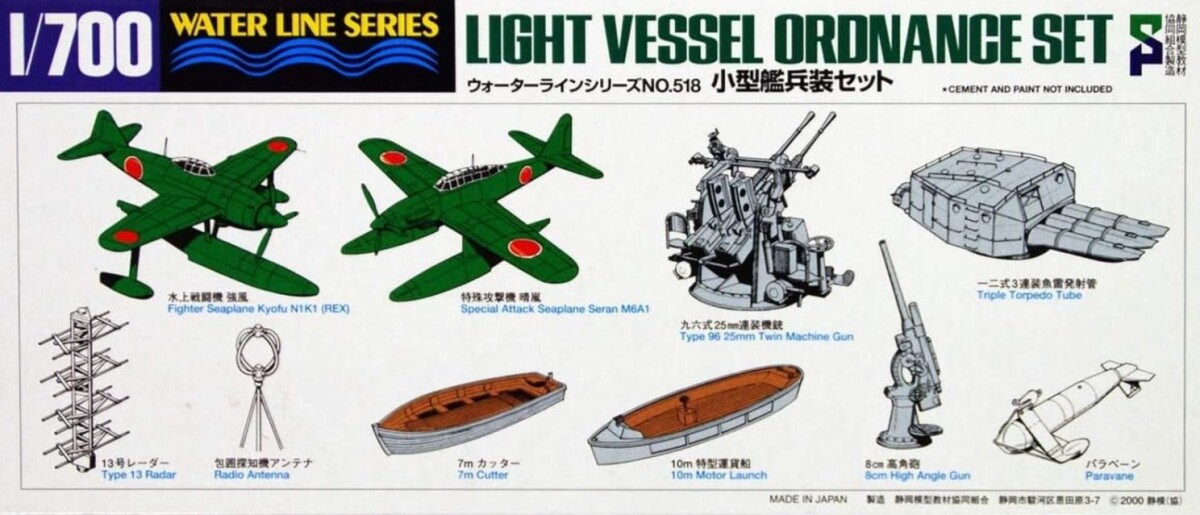 Цей набір аксесуарів зображує головні гармати, торпедні установки, прожектори та інше обладнання, що додасть більше деталей до вашої моделі есмінця, підводного човна або іншого меншого судна ВМС Японії часів Другої світової війни. Також до комплекту входять деталі для гідролітаків, таких як E14Y Glen, A6M2-N Rufe, N1K Rex та Seiran, що запускаються з підводних човнів.