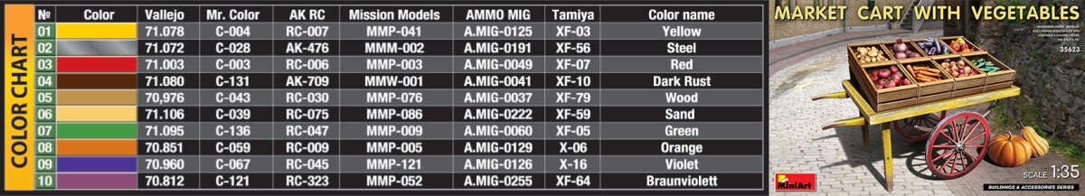 Сборная модель 1/35 Рыночная тележка с овощами Miniart 35623 с доставкой по всей Украине и магазинам Киева и Одессы. Клей и краски в комплект не входят В комплекте: литники с деталями, схема для покраски модели, пошаговая инструкция.