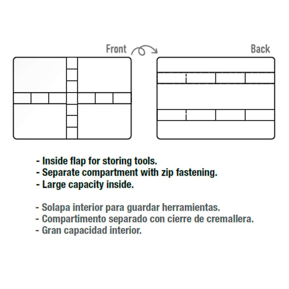 Внутренний клапан для хранения инструментов. Отдельное отделение на молнии. Большая емкость внутри.